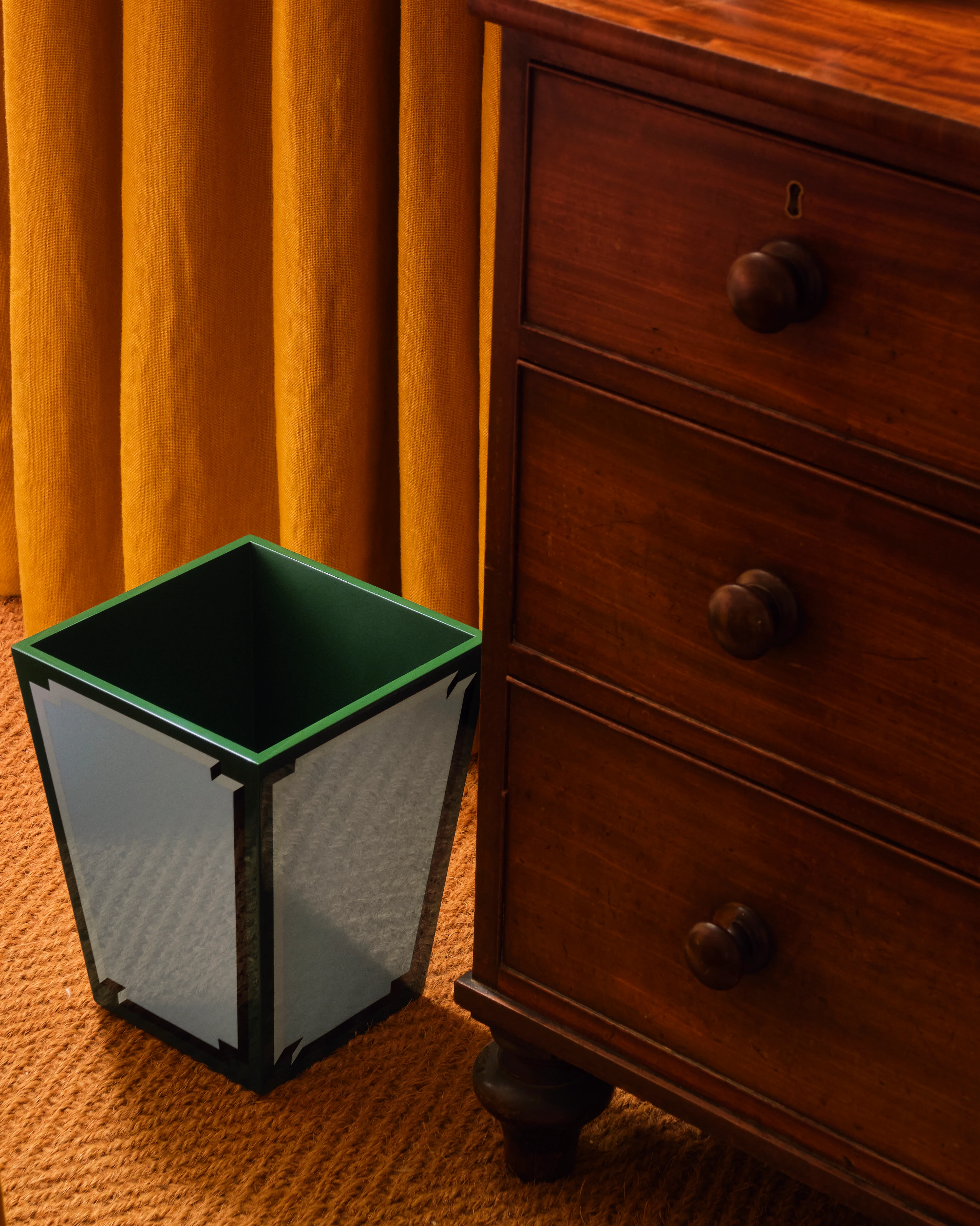 The Benedict Wastepaper Bin features trompe l'oeil painted decoration, inspired by the Regency painted furniture that Luke loves so much.