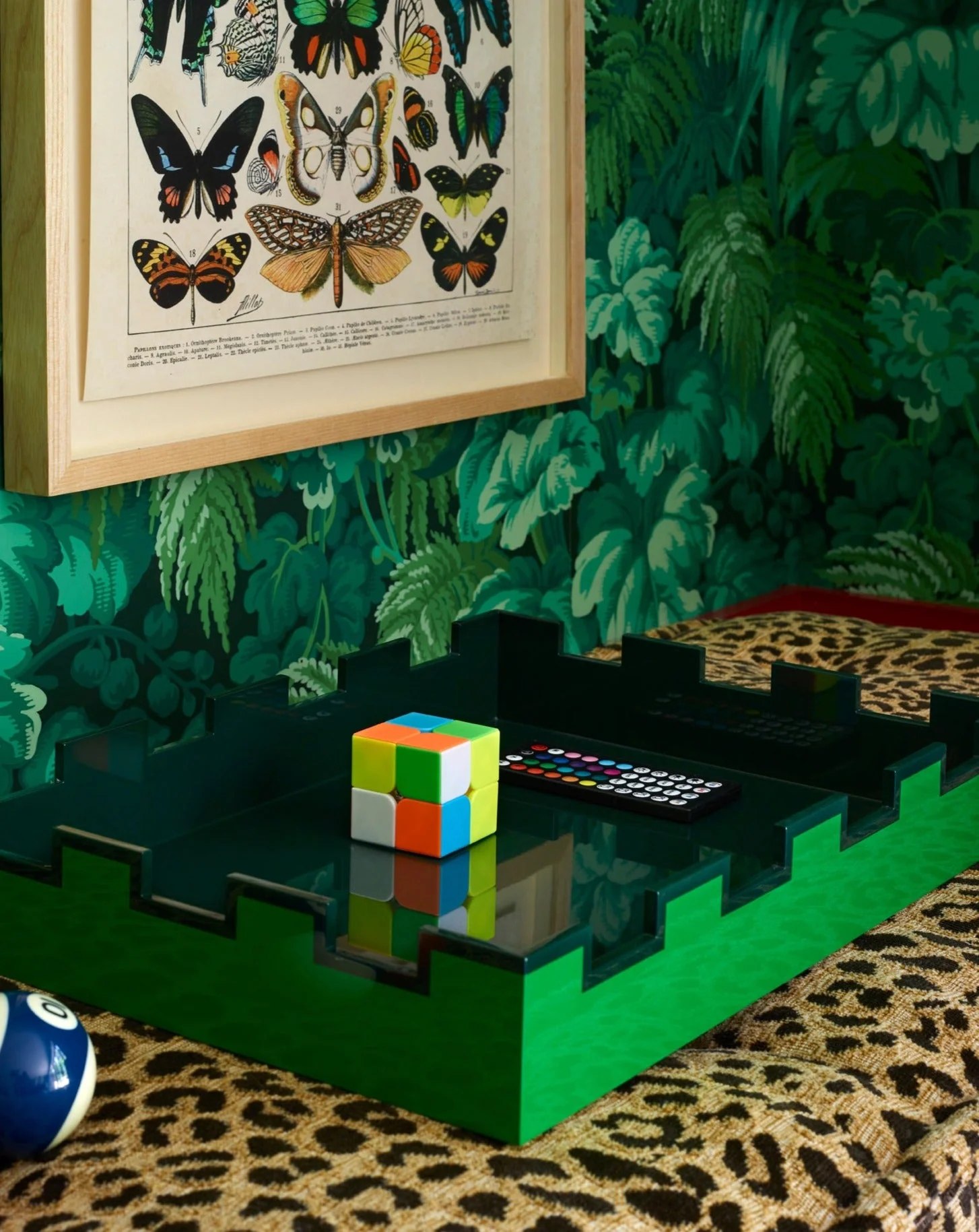Handmade Son Mai two tone lacquer tray inspired by the castellated walls and turrets at Villa Bologna in Malta.