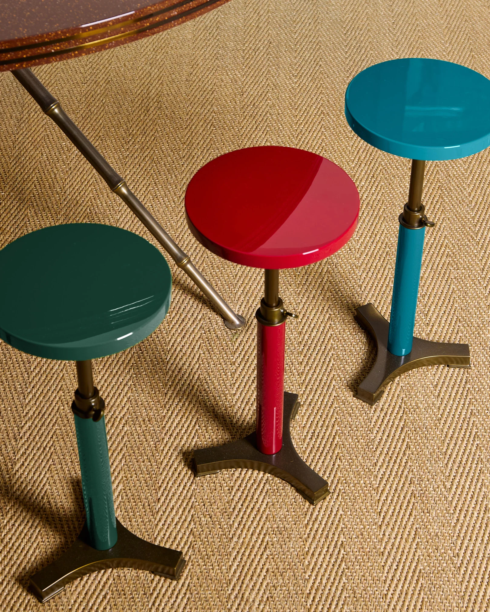 Handmade Son Mai lacquer side table with bronze hardware and adjustable height.